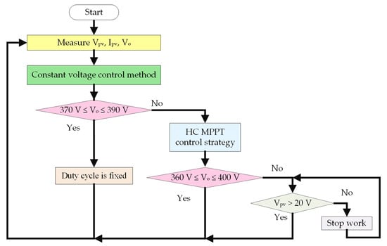 The flowchart of the constant voltage control approach paired with the HC MPPT control strategy is depicted in Figure 4. First, detect Vpv, Ipv, and Vo and then use the constant voltage control method to make Vo operate between 370 V and 390 V. Second, the constant voltage control approach is incapable of making the output voltage Vo operate between 370 V and 390 V, so then implement the HC MPPT control strategy to acquire the maximum power. However, the HC MPPT control strategy uses the perturbation mechanism to perform the MPPT. Therefore, the output voltage Vo is set between 360 V and 400 V. Lastly, if the HC MPPT control method is unable to control the output voltage Vo between 360 V and 400 V, it will be unable to supply the voltage level required by the DC microgrid, and the solar photovoltaic module’s output power will decrease. At this point, it will terminate operations, and the control technique will restart when it detects a Vpv greater than 20 V.