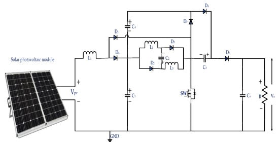 The widespread use of conventional fossil fuels has reduced fuel reserves and impacted the atmosphere, creating pollution and the greenhouse effect. Since fossil fuels can’t be replenished, we face the challenge of an energy crisis. It is essential to generate clean and renewable energy to replace traditional fossil fuels. Solar energy is promising due to its availability and the widespread application of photovoltaic generating as a method of consumption. As a result, numerous techniques have been used to enhance the effectiveness of the standalone PV system. Power generated by renewable energy sources (RES) has a low DC voltage level and needs to be increased using DC–DC converters. As a result, recent years have seen research into high step-up DC–DC converters [,,,,]. To make RES more useful, such different types of converters should be able to change voltage with a very high gain while still meeting the other quality requirements [,,]. Since the conventional boost converter (CBC) has a simple design, it seems to be the best choice for boosting the voltage of RESs []. However, the parasitic effect of passive elements at high-duty cycles restricts CBC’s ability to increase voltage adequately []. All of the traditional converters have this characteristic. As a result, research is conducted on converter combinations with boosting voltage approaches, which increase the voltage gain at low-duty cycles [,,,,]. DC–DC converters commonly incorporate boosting circuits such as switching capacitors, multiplier cells, coupled inductors, and high-frequency transformers to reach greater voltage levels [,]. In paper [], the two most well-known stepping-up methods cascading and interleaving are discussed, and both methods have their benefits and drawbacks to be consider. While the theory and implementation of the cascading approach are straightforward, the escalating number of components needed inevitably reduces the efficiency and restricts the power density of the converter. The fundamental advantage of interleaved converters for fuel cell (FC) applications is the decrease of the input current ripple. Since the interleaving technique is inadequate for the rapidly approaching ultra-high-voltage gain, the boosting cells must be used at various points in the process []. Aside from those above, switching capacitors and multiplier cells are two more widely utilized approaches in high step-up DC–DC converters [,]. Components associated with these techniques are typically situated on the output port of converters and integrated with other approaches. The major reason they are used in the high step-up converter is that they increase the voltage gain by a factor of two or three compared to converters with a small number of components. To improve the voltage gain of the boost converter, coupled inductors (CI) were added to the circuitry in work []. Since the effect on the voltage gain is good, these converters isolate certain topology components. This sort of converter uses fewer magnetic cores by winding many coils around a single core [,]. Some of the proposed converters use CIs to boost the voltage gain. However, this comes at the expense of a higher conduction loss and larger leakage inductance due to the high turn ratio required []. Therefore, they should be strategically placed in the proposed converter layouts to maximize the voltage gain despite the low turn ratio. One more benefit of using CI is that the voltage stress on components in some situations can be reduced. Choosing a suitable converter as the foundation of the setup is yet another method for increasing the voltage gain in a DC–DC converter. The quadratic boost converter (QBC) can improve the voltage gain similar to a quadratic function of the duty cycle when two CBCs are cascaded [,]. In the converter discussed in [], the power switch is subjected to a high-voltage stress equal to the output voltage, which results in dispersing the voltage stress across two power switches and reduces the voltage stress on the switches. Due to their adaptability for novel combinations, continuous input current, the presence of ground between the source and load, and visible voltage gain for the foundation of new configurations, several studies have suggested improved architectures for quadratic boost converters. In addition to their use in hybrid inverters, quasi-Z-source and Z-source converters are the other two types of converters for high step-up applications [,,,]. The Z-source converter is restricted in its RES applications by its discontinuous input current, poor voltage gain, and shared ground between the load and source. Although a quasi-Z-source converter can have a common grounded configuration and receive a constant input current, the voltage gain is low, requiring numerous voltage boosting stages for functioning similar to an ultra-high-voltage gain converter. The research on high step-up DC–DC converters has shown some important things they all have in common. These are a lower number of components, high-voltage gain, common ground between source and load, high efficiency, low voltage stress on the circuit components, and a steady input current.