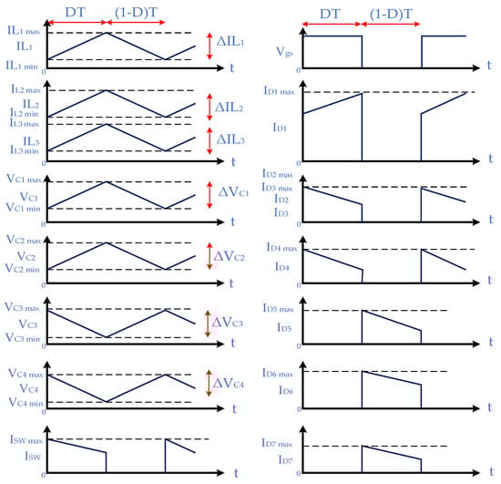 Figure 6 displays the steady-state waveform of the proposed converter across all passive components and the current following through all active devices. During period DT, the switch (SW) is turned on; the inductor currents IL1, IL2, and IL3 rise until IL1max, IL2max, and IL3max, respectively; and the current across the switch, ISW, also decreases. The capacitors C1 and C2 start charging, and the diodes D1, D2, D3, and D4 are forward-biased; hence, the diode currents ID1, ID2, ID3, and ID4 rise until the ID1max, ID2max, ID3max, and ID4max. The diodes D5, D6, and D7 are reversed-biased during this period. Hence, there is no diode currents ID5, ID6, and ID7. During period (1D) T, the switch is turned off as a result, and the inductor currents IL1, IL2, and IL3 fall until the IL1min, IL2min, and IL3min, respectively. During the same time interval, the current across the switch SW is zero, and the capacitors C1 and C2 start discharging while the capacitors C3 and C4 start charging. The diodes D1, D2, D3, and D4 are reverse-biased; hence, the diode currents ID1, ID2, ID3, and ID4 fall until the ID1min, ID2min, ID3min, and ID4min. The diodes D5, D6, and D7 are forward-biased during this period. Hence, there are no diode currents ID1, ID2, ID3, and ID4. The same cycle is repeated for the next period.