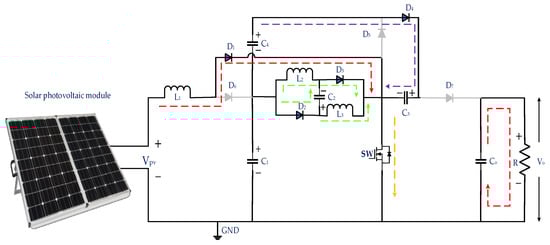 The generalized circuit diagram of the proposed topology is given in Figure 5. The circuit comprises three inductors, i.e., L1, L2, and L3, and five capacitors, C1, C2, C3, C4, and Co, including seven diodes D1, D2, D3, D4, D5, D6, and D7 and one power MOSFET switch. The voltage multiplier cell (VMC) consists of two inductors, L2 and L3, one capacitor C2, and two diodes, D2 and D3. The integrated switch capacitor network comprises two capacitors, C3 and C4, and two diodes, D4 and D5.