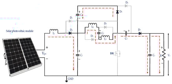 Figure 8 depicts the working principle during the second mode operation. At this time, the voltage will add up, and the gain will be transferred to the output via diodes D6 and D7. The inductor L2 will charge the capacitor C4 via diode D5. In this mode, inductors L1, L2, and L3 are energy storage inductors, and diodes D5, D6, and D7 are only forward-biased. During this mode of operation, all other diodes will be biased in reverse.
