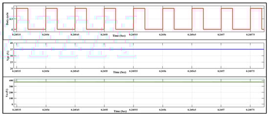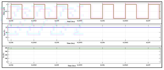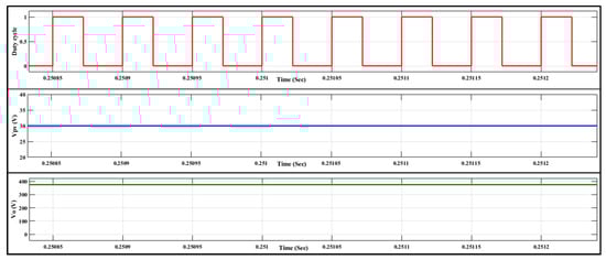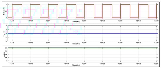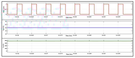 From Figure 9, Figure 10, Figure 11, Figure 12 and Figure 13, the values of Vpv are 20 V, 25 V, 30 V, 35 V, and 40 V, respectively. The duty cycle of the proposed novel high-voltage gain step-up (HVGSU) converter is adjusted through Equation (24). The output voltage produced by the HVGSU converter is stable at 380 V.