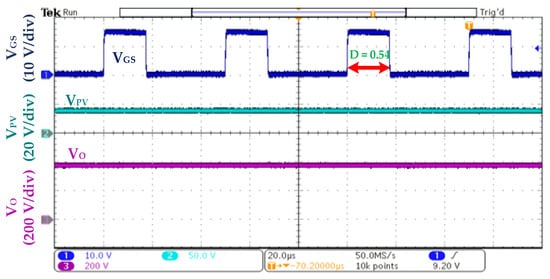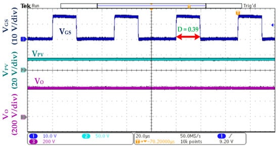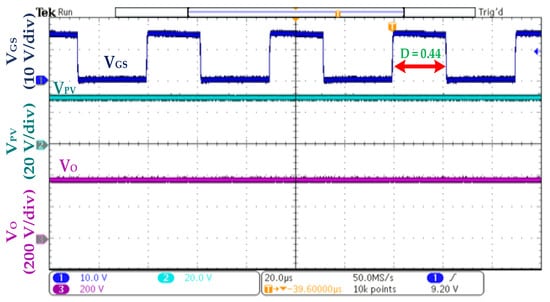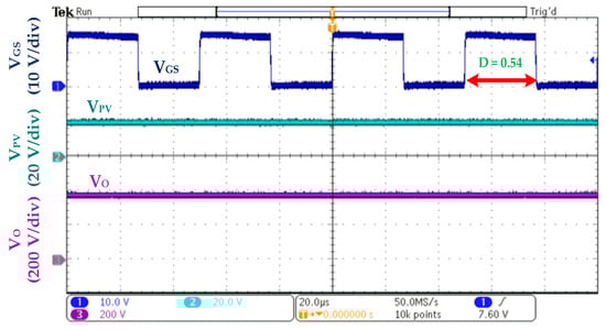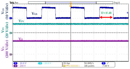 Figure 16 shows the measured waveforms for the solar PV simulator (Vpv) and output voltage (Vo) for the proposed HVGSU converter, with an input voltage of 20 V and a duty cycle of 0.54, in order to generate a DC microgrid voltage of 380 V (as shown in Figure 1). The experimental results show that the duty cycle is small, which reduces the conduction losses and enhances the converter efficiency.