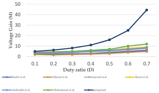 Figure 21 briefly compares the ideal voltage gains of a recently proposed non-isolated based architecture. Among the potential topologies, the group of Mohammad et al. [] suggested a VMC-based topology with a (3D) timed quadratic-based boost voltage gain. The configuration described in Section 1 not only improves the voltage gain but also reduces the switch’s voltage stress (i.e., switch’s voltage stress is 2 Vo/(3D) [] and proposed topology Vo/2. It can also be concluded from Figure 21 that the voltage gain of the proposed converter is much better that the other recently proposed HVGSU converter. Table 5 compares the seven distinct topologies and concludes that the proposed circuit offers superior performance and cost advantages.