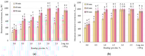 Resistance to extension as a function of Rp addition: (a) Resistance to extension at 50 mm (R50); (b) Maximum resistance to extension (Rmax). Different capital letters represent statistically different mean values (p ≤ 0.01) of each sample for different times (30, 60, and 90 min). Different lower-case letters are responses statistically different (p ≤ 0.01) of all samples for each time (30, 60, and 90 min). BU—Brabender Units, AA—ascorbic acid.