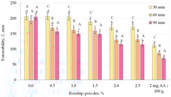 Extensibility (E, mm) as a function of Rp addition. Different capital letters represent statistically different mean values (p ≤ 0.01) of each sample for different times (30, 60, and 90 min). Different lower-case letters are responses statistically different (p ≤ 0.01) of all samples for each time (30, 60, and 90 min). AA is ascorbic acid.