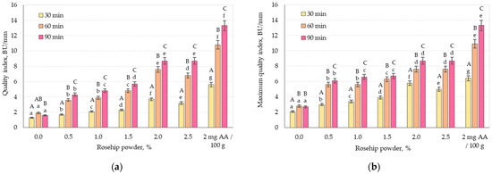 Ratio numbers as a function of Rp addition: (a) Ratio number, R50/E, in BU/mm; (b) Maximum ratio number, Rmax/E, in BU/mm. Different capital letters represent statistically different mean values (p ≤ 0.01) of each sample for different times (30, 60, and 90 min). Different lower-case letters are responses statistically different (p ≤ 0.01) of all samples for each time (30, 60, and 90 min). BU—Brabender Units, AA—ascorbic acid.