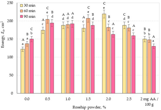 Dough energy (Ed, cm2) as a function of Rp addition. Different capital letters represent statistically different mean values (p ≤ 0.01) of each sample for different times (30, 60, and 90 min). Different lower-case letters are responses statistically different (p ≤ 0.01) of all samples for each time (30, 60, and 90 min). AA is ascorbic acid.