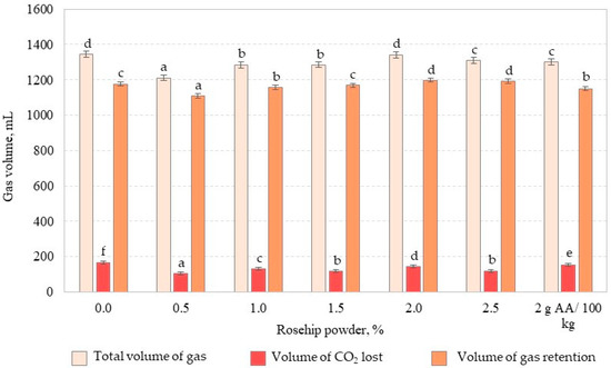 Gas volume as a function of Rp addition. Different lower-case letters represent statistically different mean values (p ≤ 0.01). AA is ascorbic acid.