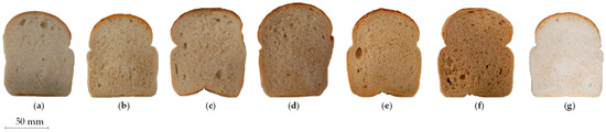 Images of bread samples: (a) control; (b) bread with 0.5% w/w Rp; (c) bread with 1.0% w/w Rp; (d) bread with 1.5% w/w Rp; (e) bread with 2.0% w/w Rp; (f) bread with 2.5% w/w Rp; (g) bread with 2 mg AA/100 g.