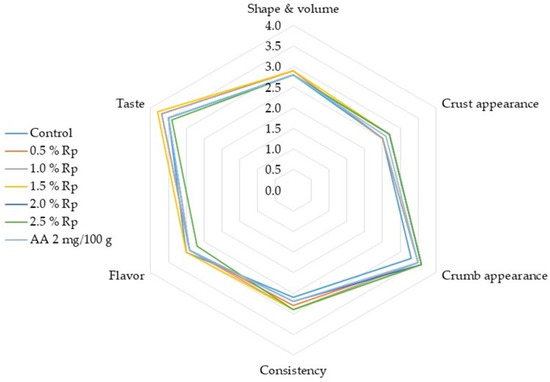The 20-point sensory test indicates a good acceptance of all the bread samples. Figure 7 presents the scores of sensory properties of evaluated bread The panel of assessors most appreciated the shape and volume, crumb appearance, flavor, and taste. Thus, the average scores of the shape and volume were 2.9 for bread with 0.5% w/w, 1.0% w/w, and 1.5% w/w Rp and 2.8 for the other bread from a maximum of 3 points. The bread with 1.5% w/w Rp obtained the highest scores for the flavor (3 points) and taste (3.8 points). Additionally, the crumb appearance received 3.6 points for bread with 1,5% w/w, 2.0% w/w, and 2.5% w/w Rp, 3.3 points for the control, and 3.5 points for the other bread. The other sensory attributes received good average scores, i.e., 2.5–2.7 for crust appearance and 2.6–3.0 for crumb consistency and chewing behavior. Although the Rp addition varies between 0.5% w/w and 2.5% w/w, the amounts being set primarily according to the AA requirement in the dough, the bread samples differ in crust appearance, crumb appearance, crumb structure and volume. However, the differences are not very large, as the results show. Therefore, the bread samples are close regarding sensory behavior (Figure 7).