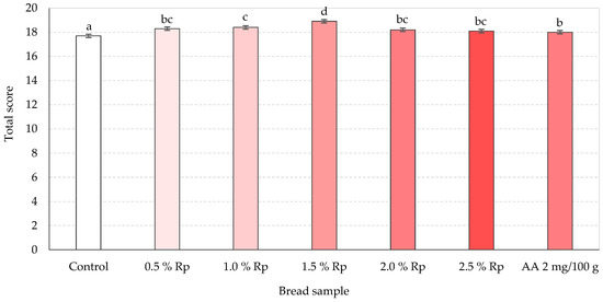 Regarding the total score (Figure 8), all the bread samples obtained high values, the lowest one for control bread (17.7 points) representing 88.5% of 20 points. Thus, the bread with 1.5% w/w Rp scored 18.9 points, followed by bread with 0.5% w/w Rp (18.6 points), 1.0% w/w Rp (18.4 points), 2.0% w/w Rp (18.2 points) and 2.5% w/w Rp (18.1 points). According to ANOVA, the differences are significant (p < 0.05). The bread with an addition of 2 mg AA/100 g scored 18.0 points and is situated between the control and samples with Rp addition.