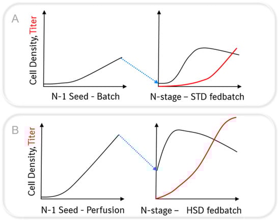 Illustration of N-1 prestage and N-Stage of the conventional standard (STD) process (A) and high seeding density process (B). The STD fed-batch N-Stage is inoculated with a batch N-1 stage, while the HSD fed-batch N-Stage is inoculated with an N-1 perfusion stage, where cells are retained through a filter module to reach high cell densities. Black color line describes cell density and red line describes titer. Blue dotted arrow describes transfer from N-1 into N-Stage.