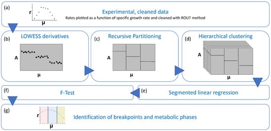 Workflow for identification of metabolic phases with the segmented modeling approach (modified process of Yahia et al. [14]). (a) Raw experimental data of specific rates were plotted as a function of specific growth and then were cleaned with the ROUT method. (b) The data were smoothed with the LOWESS method and the derivatives of LOWESS were calculated. (c) Recursive partitioning was used to split all calculated derivatives of each metabolite into sub-populations. (d) Similar breakpoints were identified with hierarchical clustering. The final number of clusters selected was chosen as the first knee point in the linkage function. (e) Segmented modeling is a method in which the specific growth rate is partitioned into intervals and each interval is modelled using linear regression. The breakpoints used in the segmented linear regression were the values of the two line segments intersections. (f) The segmented modeling process was analyzed with the F-Test to avoid overfitting and to reduce the number of breakpoints if this makes the model statistically superior. (g) With the F-Test, the final number of breakpoints and therefore the metabolic phases are identified.