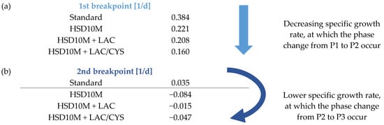 Segmented modeling results in the identification of breakpoints; these breakpoints describe when cells enter a new metabolic phase. Figure 4 describes the identified breakpoints for the different process types. Each breakpoint is described in terms of the corresponding specific growth rate to provide a better understanding. The first breakpoint describes the change from the 1st to the 2nd metabolic phase; the value of the first breakpoint decreases from the STD process to HSD10M, HSD10M + LAC and finally to HSD10M + LAC/CYS. The second breakpoint describes the change from the 2nd to 3rd metabolic phase; it occurs at higher specific growth rates in the STD process compared to the other process types. The decrease in the specific growth rate in which the breakpoint is identified from the first into the second metabolic phase correlates with an increasing final titer concentration. This cannot be seen in the second breakpoint. These results may be explained by the observation that the first metabolic phase is characterized by cell growth, while the second and third phases are characterized by a titer increase. Therefore, an earlier shift from phase 1 to phase 2 may be relevant for the final titer in contrast to the transition from phase 2 to phase 3.