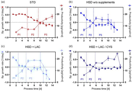 Illustration of identified phases with the data of specific growth rate and specific productivity against the process time for the processes: (a) standard (2), (b) HSD10M without supplementation (5), (c) HSD10M with LAC supplementation (3) and (d) HSD10M with LAC/CYS (2) supplementation. The number in the brackets behind the process types shows the number of runs which were used for this analysis. STD, standard process with seeding density of 0.7 × 106 cells/mL; HSD10M, process with the seeding density 10 × 106 cells/mL; +LAC, supplemented with lactate; +LAC/CYS, supplemented with lactate and cysteine.