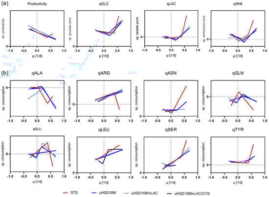 Comparing the different models of asparagine, the trendline of asparagine has a higher slope at high growth rates for the STD process compared to the HSD processes. Therefore, the increased consumption of ASN in the STD process is a major reason for the increased ammonia production (Figure 7). As mentioned before, the increased uptake shows that the HSD process is not just shifted in time, but also the metabolism is altered. This can also relate to differences in the early and late exponential growth phases as already stated by Vodopivec [32].