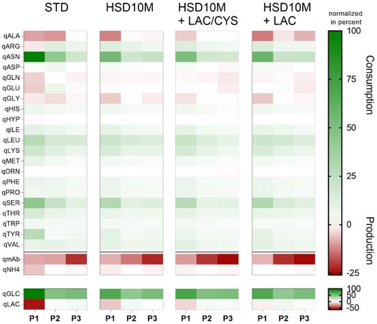 Heatmap of the median consumption and production of the amino acids, glucose, lactate and ammonium, and productivity. The phases of each process type were identified with segmented linear modeling for the processes: standard (2), HSD10M without supplementation (5), HSD10M with LAC supplementation (3) and HSD10M with LAC/CYS (2) supplementation. The number in the brackets shows the number of runs which were used for this analysis. STD, standard process with seeding density of 0.7 × 106 cells/mL; HSD10M, process with the seeding density 10 × 106 cells/mL; + LAC, supplemented with lactate; + LAC/CYS, supplemented with lactate and cysteine. ASP = aspartate; GLY = glycine; HIS = histidine; HYP = hydroxyproline; ILE = isoleucine; LYS = lysine; MET = methionine; ORN = ornithine; PHE = phenylalanine; PRO = proline; TRP = tryptophan; TYR = tyrosine; VAL = valine; mAb = monoclonal antibody. The prefix q describes the specific rates of consumption or release.