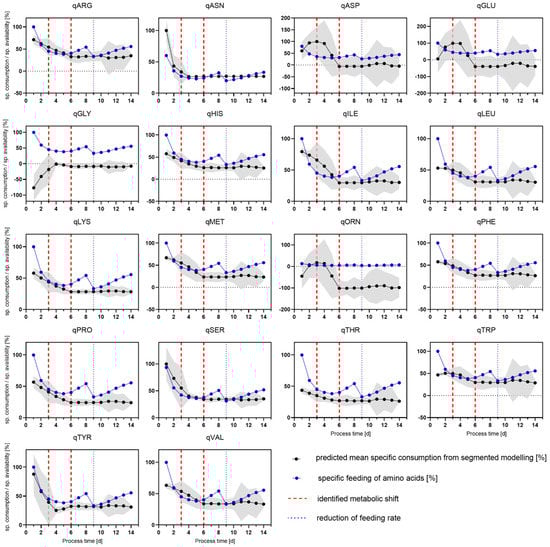 Comparison of predicted mean specific consumption from segmented modeling (average model which comprised three different HSD processes) with the specific feeding of amino acids. The identified metabolic shifts are depicted in red and the reduction in the feeding rate is shown in blue.