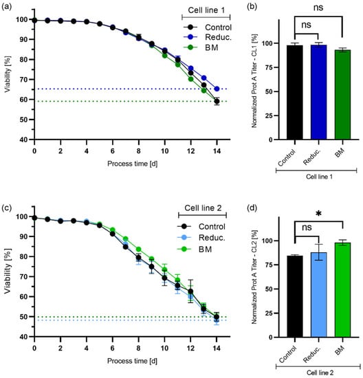 (a,c) Viability and (b,d) pre-harvest titer (normalized) for the cell line 1 (a,b) and cell line 2 (c,d) with the comparison of three processes: the HSCD10M control process (black), the HSD10M process with an earlier reduction in the feeding rate (denoted Reduc. in blue) and the HSD10M process with addition of bolus media (on process day 0–5) with the amino acids asaparagine, aspartate, glutamate and isoleucine (denoted BM in green). The processes were performed in duplicate (n = 2). An unpaired t-test was performed for the Prot A titer at harvest. n.s. means not significant, * means p ≤ 0.05.