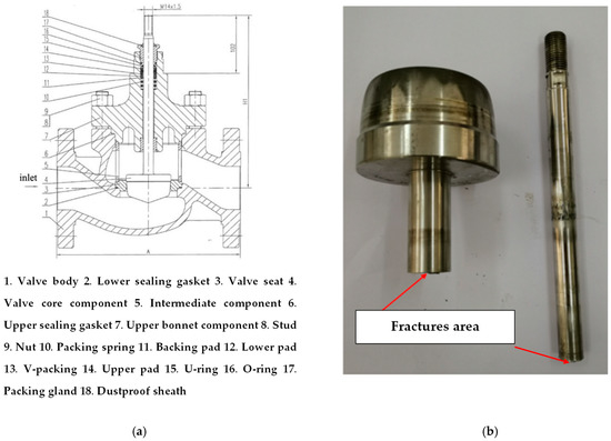 Diagram of the studied regulating valve; (a) Structural diagram of the regulating valve; (b) Fractured stem of the regulating valve.
