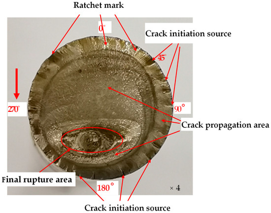 Based on Figure 3, a macroscopic examination of the fracture position and fracture surface was carried out in four different directions. The fracture surface exhibited a smooth appearance without any notable plastic deformation or shear lips, but fatigue striations were observed, suggesting that the fracture resulted from fatigue failure. Typically, fatigue fracture exhibits a characteristic inclined fracture surface at an angle of 45° to the axial direction of the rod. However, in this particular case, a significant stress concentration phenomenon was present at the valve stem radius transition, and the fracture occurred along the direction of maximum stress concentration. Figure 3 depicts a schematic of the fatigue feature area of the fracture, which shows the crack origin area, fatigue propagation area, and brittle fracture area. The crack was initiated from the stress concentration area around the small end of the valve stem, and multiple crack sources were identified, indicating that multiple sources of initiation occurred. After the crack was initiated from the stress concentration area, it propagated towards the center under alternating bending loads. When the crack propagation of adjacent crack sources overlapped, a ratchet mark was formed. Multiple obvious ratchet marks could be observed around the fracture surface, indicating that the crack initiated from multiple sources along the edge of the small rod.