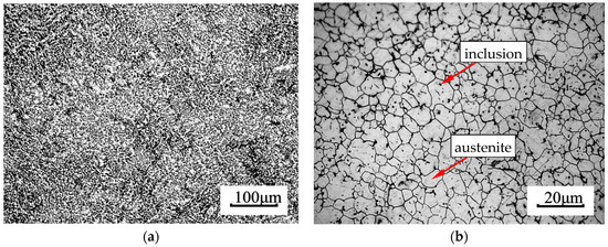 To investigate the root cause of the valve stem fracture, a sample of the valve stem was taken for metallographic observation. Figure 4 shows the microstructure of the base material near the fractured valve stem. Figure 4a,b show metallographic images of the stem material at 100× and 500× magnification, respectively. It exhibits a normal austenite structure with a grain size of 10 to 11, and non-metallic inclusions at a level of 0.6.