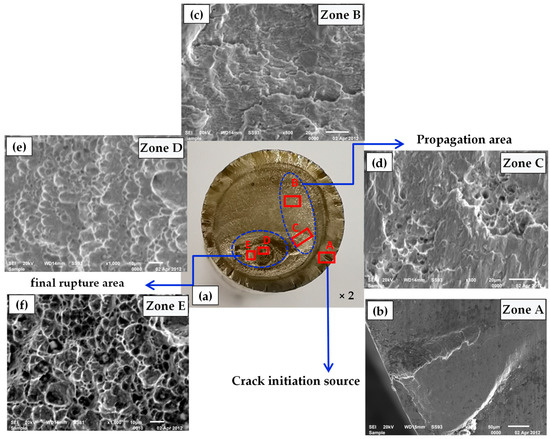 SEM images of the fracture surface. (a) SEM observation locations of the fracture. (b) Fracture pattern of area A at the crack source (300×). (c) Fracture pattern of B crack propagation area (800×). (d) Fracture pattern of C crack propagation area 5 (800×). (e) Fracture pattern of D final fracture area (1000×). (f) Fracture pattern of E final rupture area (1000×).