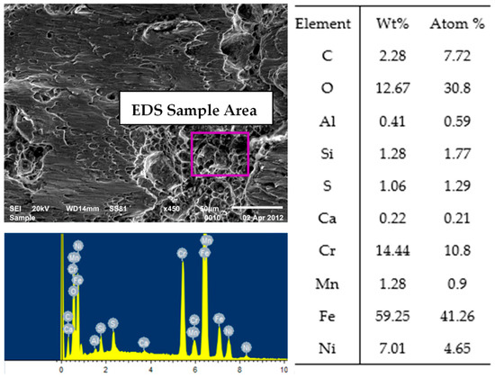 The energy dispersive spectroscopy (EDS) analysis of an example is presented in Figure 6. The results indicate that metal oxides are the main product of the fracture, with some local areas containing residual sulfides from the media.