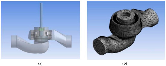 Regulating valve model and grid model diagram; (a) Regulating valve model; (b) Grid of overall flow channel model.