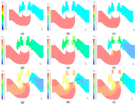 Contour maps of pressure distribution on the symmetrical surface at various valve openings: (a) 1%; (b) 2%; (c) 5%; (d) 10%; (e) 15%; (f) 40%; (g) 60%; (h) 80%; (i) 100%.