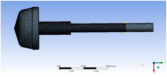 Based on the wet mode theory [30], the fluid surrounding the valve core and valve stem is taken as the unidirectional fluid-structure interaction mode in this paper. The modal analysis on the regulating valve is conducted with the wet mode. ANSYS Workbench was used to simulate the stem and valve core of the single-seat regulating valve, and a fluid-structure interaction model was established with SolidWorks software, as illustrated in Figure 10. The grid number is 77,517. Steady-state flow field calculations for the throttling model at each typical opening were performed with reference to the boundary conditions of the flow field of the regulating valve in Section 3.1. In the static field, fixed constraints were imposed on the inlet and outlet ends of the regulating valve. The flow field information was loaded in the static field to obtain the fluid-structure interaction surface pressure information. The elastic modulus of 316 L austenitic stainless steel was set to E = 206 MPa, the density was 7.98 g/cm3, and the Poisson’s ratio was set to u = 0.3.