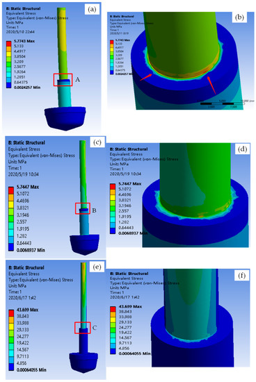 The total deformation diagram and equivalent stress diagram of the valve core and stem; (a) Equivalent stress diagram at 2% opening; (b) Enlarged view of Zone A; (c) Equivalent stress diagram at 15% opening; (d) Enlarged view of Zone B; (e) Equivalent stress diagram at 60% opening; (f) Enlarged view of Zone C.