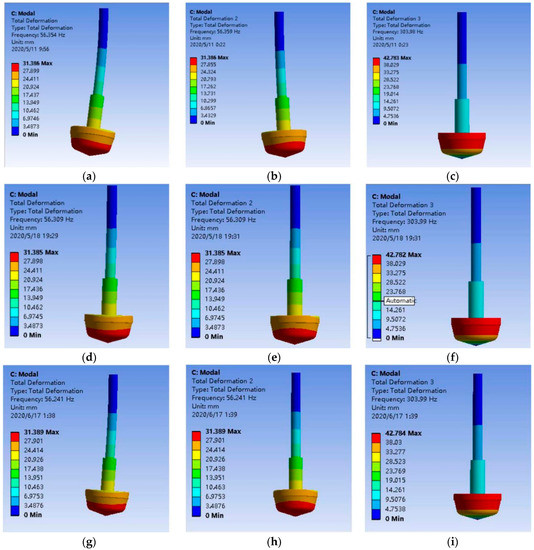 Vibration mode diagrams for the first, second, and third order modes at valve openings of 2%, 15%, and 60%; (a) First-order mode at 2% opening; (b) Second-order mode at 2% opening; (c) Third-order mode at 2% opening; (d) First-order mode at 15% opening; (e) Second-order mode at 15% opening; (f) Third-order mode at 15% opening; (g) First-order mode at 60% opening; (h) Second-order mode at 60% opening; (i) Third-order mode at 60% opening.