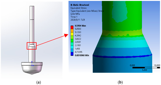 Consequently, the absence of a smooth transition in this region and the high stress concentration in the variable diameter part of the valve stem is the main reason for the valve stem fracture. Therefore, the structure was improved in the variable diameter region of the valve stem, as shown in Figure 13a. Figure 13b displays the local stress distribution in the variable diameter region. It can be seen from the figure that the stress decreases at the smooth transition of the variable diameter region, thus avoiding stress concentration and improving the safety of the valve stem.