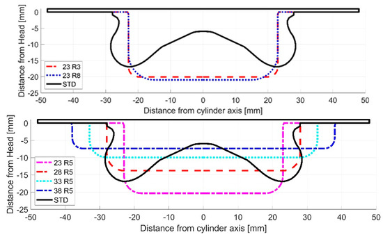 - Radius of the piston bowl: 23, 28, 33 and 38 mm;
