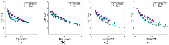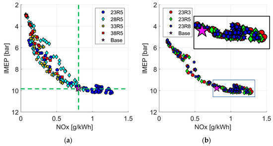 - There were several new configurations that yielded the same IMEP and lower NOx; in particular, the configuration with tilt = 90° and offset = 4 mm reduced the specific NOx by 38% (0.54 vs. 0.33 g/kWh) compared with the baseline at the same IMEP (4.9 bar).