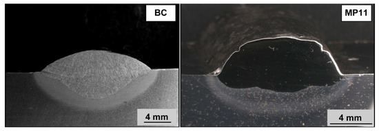 The weld metal cross section photographs in Figure 1 display the base case (BC) weld made without any metal powders added, in comparison with the MP11 weld metal cross section made with the addition of metal powders, namely 7 g each of Al, Cr, Co and Cu. Metal powders were sourced from the following chemicals suppliers: Al (99.7% Al) and Co (99.9% Co) from Sigma-Aldrich (St. Louis, MI, USA), Cu (99.8% Cu) from GoodFellow, and Cr (99.0% Cr) from Alfa Aesar, Ward Hill, MA, USA. The welding parameters applied in all welding tests were the same. The analysis methods applied to the input materials, namely the base plate steel, steel weld wire and the flux, were described previously [5].