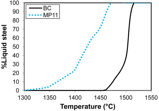 Solidification curves for MP11 and BC weld metal compositions from Table 3 (mass% proportion liquid phase in steel).