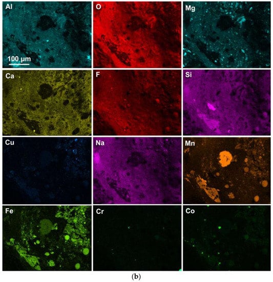 The framed area in Figure 4a is shown in Figure 5a at a magnification of 3930× to better view the 3D structures in this area. The EDX maps of the FOV, as displayed in Figure 5b, confirm that the dome surface matrix phase at the left-hand boundary of the image consists of Al-Mg-Ca-Si-Na-K-Ti-Fe-Mn oxy-fluoride, with embedded spheres of Fe-Mn-Na-Cu oxy-fluoride. Interestingly the separate presentation of Cr and Co is observed in the porous structure of about 10 µm as adjacent parts of Cr oxy-fluoride and Co oxy-fluoride. To the right side of the porous 3D structure, the round structure embedded in the dome surface matrix phase appears; it contains Si-Cu-Na-Mn-Fe oxy-fluoride, although the copper EDX map is faint in this area. The average EDX analysis of the FOV in Figure 5a, as shown in Table 5, confirms that less of the dome surface matrix phase is contained in Figure 5a, since less Al and Mg are present in this analysis when compared to that of Figure 4a.