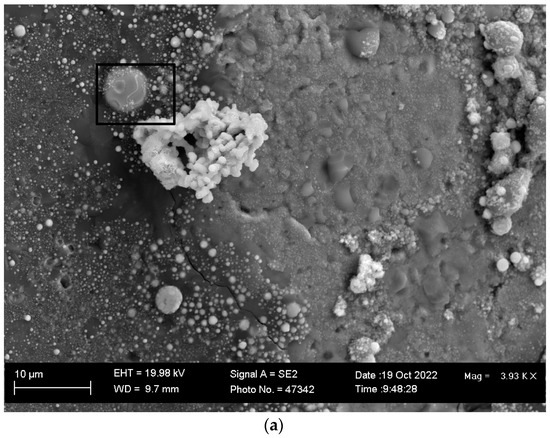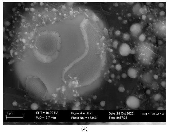 The blocked area in Figure 5a is shown enlarged at 28,290× in Figure 6a. Nano-sized oxy-fluoride strands and spheres are seen at the edges of this image, similar to those identified previously [37]. In agreement with the previous conclusions of Coetsee and De Bruin, these structures confirm the vaporisation and re-condensation of oxy-fluorides within the slag dome structures [4,37]. The EDX maps show that Cu and Na formed a distinct condensation pattern on the surface of the Si-Cu-Na-Mn-Fe-Co oxy-fluoride sphere. The Co content in the sphere is very faint in Figure 6b. The average EDX analysis of the FOV in Figure 6a is similar to that of Figure 5a, with less Mn and more Fe contained, and an increased Cu content confirmed, see Table 5.