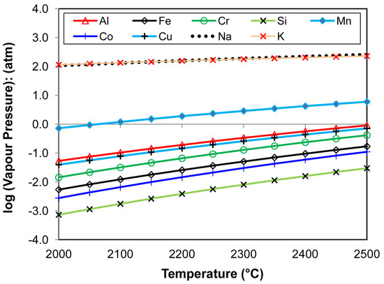 MP11 expected metal loss to gas according to gas–slag–metal powder equilibrium at 2500 °C, calculated in FactSage 7.3 thermochemical software (Equilib module) [35].