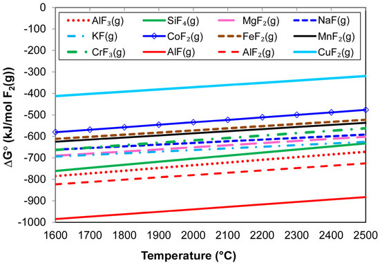 Previous Gibbs free energy calculations confirmed that NaF(g) and KF(g) are most easily formed from reaction of Na2O and K2O with CaF2 in reactions of the type displayed in Equation (11) [3,10,11]. The relative position of the lines in Figure 8 indicates that the fluorides of the main elements in the SAW reaction system considered here may all be transformed by reaction with Al(g) to release metal vapour in reactions similar to the reaction in Equation (10). Particularly, copper and cobalt may be transformed in this way, as the lines in Figure 8 for CuF2(g), as per Equation (6), and CoF2(g), as per Equation (8), have the larger difference from the Al-fluoride formation lines, such as seen in Equation (9).