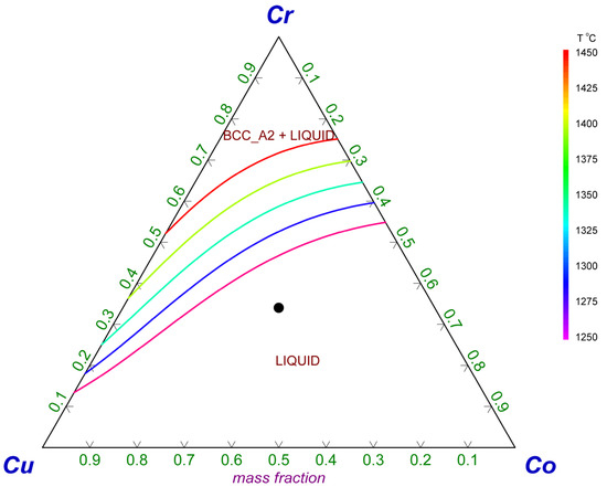 Cr-Cu-Co-22% Al liquidus projection diagram calculated in FactSage 7.3 [35].