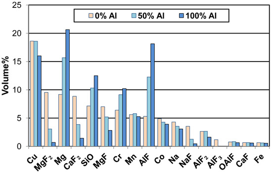 The metal powder input masses of 7 g each of Cr, Co and Cu were specified as inputs to the calculation. The Al input mass in the calculation was varied between zero, 50% and 100% of the maximum of 6.1 g Al. The calculation in Section 3.3 shows that 0.90 g Al of the input value of 7 g Al was used in the aluminothermic reduction reactions, Equations (2) and (3). Therefore, the input of Al at 100% Al usage for the gas phase reactions was set as 6.1 g Al. The major compounds in the calculated gas compositions are displayed in Figure 10 at the different levels of aluminium added. Table 6 displays the calculated loss percentages of Cr, Co, Cu and Al to the gas phase, the gas phase partial oxygen pressure (PO2) values, and the calculated free electron concentration in the plasma, as calculated in FactSage 7.3. Although arc cavity temperatures for SAW are much lower than in other open arc-welding techniques, the formation of arc plasma is still relevant. The free electron concentration in the gas phase is an indication of the level of arc stability due to plasma formation [42]. The first ionization potential of the elements is typically quoted in welding research as an indication of the likely importance of an element in arc plasma stability reactions by releasing electrons upon ionization [1,23,24,43]. Because metals have lower ionization potentials as compared to non-metals, the metals are ionized preferentially [43]. The metals of Al, Cu, Cr and Co all have similar ionization potentials of 5.986, 7.726, 6.767 and 7.881, with that of Al at the lower level among these elements [44]. Therefore, all of the metals may be ionized, but Al, at the comparatively lower value of 5.986, should be ionized more readily. The relative change in free electron concentration at equilibrium as shown in Table 6 indicates that Al(g) plays a role in this effect. In comparison, no such effect was observed in changing the copper addition level in the calculations. In contrast, the lower ionization potentials of K and Na at 4.341 and 5.139 are in agreement with the reason for adding these elements to the welding flux to stabilise the arc [41,44].