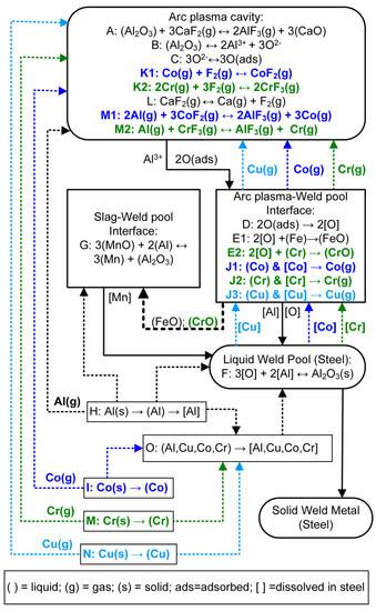 Reactions M1 and M2 in Figure 11 indicate the reaction of aluminium vapour with the fluorides of chromium and cobalt, CrF3(g) and CoF2(g), to transform these fluorides to Cr and Co vapour. Chromium, cobalt and copper can be vaporised from various reaction sites. These sites include the weld pool surface at the arc plasma–weld pool interface, as well as the unconstrained molten metal powder surfaces before the metal powders are dissolved into the alloy pool or the weld pool. The results presented here are in agreement with previous similar work on the SAW process, in which different metal powder combinations with aluminium and copper were applied [7,8,9,11].