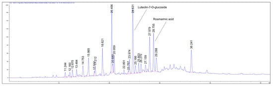 S. montana is rich in various phenolic components, including phenolic acids (such as rosmarinic acid (RA) and other caffeic acid derivatives [], as well as in derivatives of different flavonoids such as derivatives of quercetin, catechin [] or luteolin (e.g., luteolin-7-O-glucoside (LG)) []. Additionally, S. montana contains triterpenic acids, such as ursolic or oleanolic acid []. Among numerous phytochemicals, RA and LG are among the most interesting ones, not only due to their reported abundance in S. montana [] but also because they display numerous skin-related activities. For example, LG promotes wound healing and exerts anti-inflammatory, antioxidant, anti-hyaluronidase, and anti-collagenase activity []. In addition, LG-rich Jasione montana extracts displayed antioxidant and anti-inflammatory activity, promoted cell viability, and accelerated the migration of fibroblasts in an in vitro study []. On the other hand, RA is one of the most researched phytochemicals for skin care. It acts beneficially on many skin conditions, including skin aging []. It also works as an anti-microbial, immunomodulatory, anti-allergic, and anti-inflammatory agent [].