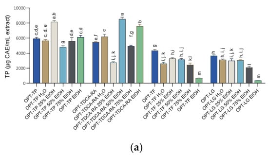 The HCGAE extract optimized for the best TDCA extraction (OPT-TDCA-RA) contained the highest TDCA content. Statistically equivalent TDCA content was also found in OPT-TP 25% EtOH and OPT-TP 100% EtOH (Tukey post-test, p < 0.05). In general, for all four sets of extraction conditions, pure ethanol was the least suitable solvent for TDCA extraction, followed by water. The HCGAE extract optimized for the highest TF content, OPT-TF, was superior to all the other prepared extracts (Tukey post-test, p < 0.05). In general, the conditions used for preparing TF-OPT were the best suited for preparing the extracts with the highest TF. In the case of TDCA, ethanol was the least effective solvent for TF extraction, regardless of the extraction conditions.