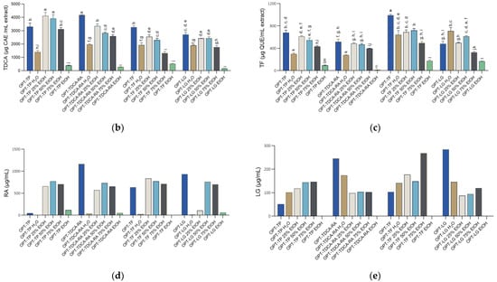 As observed in Figure 2, extraction conditions greatly influenced the yield of phenolic compounds. In general, the addition of HP-β-CD and GL resulted in an increase in the content of target phenolics in a large majority of extracts. However, OPT-TP, the extract optimized for TP content, while containing a significant amount of phenolic compounds, was not the extract richest in TP. Three extracts, OPT-TP 25% EtOH, OPT-TDCA-RA 50% EtOH, and OPT-TDCA-RA EtOH, contained more phenolics (Tukey post-test, p < 0.05). The reason may be that TP also includes macromolecular phenols such as tannins. They are generally well extracted using diluted ethanol solutions. At the same time, depending on tannin type and concentration, they may not be fully soluble in GL solutions, for example, in the case of condensed tannins powder from wattle species that were dissolved using water/GL mixtures and sulfuric acid as a catalyst []. In polyol solutions, tannins may form hydrogels, as exemplified in chestnut-tannin-crosslinked organohydrogel prepared with polyvinyl alcohol and water/GL as the solvent system []. In general, the extraction conditions used for preparing OPT-TP and OPT-TDCA-RA were better suited for preparing the extracts rich in TP than the other two sets of conditions.
