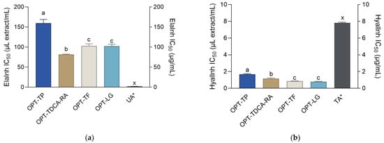 Inhibitory activity of the extracts and corresponding positive controls: ursolic acid (UA) and tannic acid (TA) on (a) elastase and (b) hyaluronidase. The activities are shown as IC50 values ± SD. a–c = differences between the extracts within a column (ANOVA followed by Tukey’s post-test, p < 0.05). x = differences with the positive control (ANOVA followed by Dunnett’s post-test, p < 0.05). Columns not connected with the same letter are statistically different. Asterisk indicates that the unit is placed at the right ordinate.
